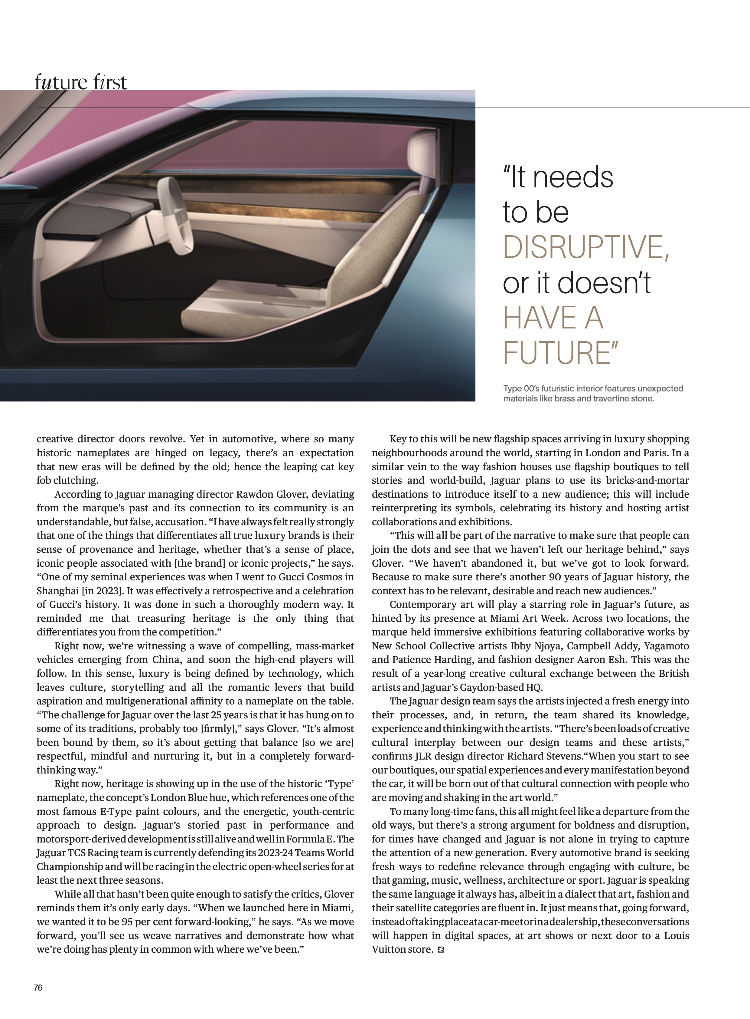 Right now, we’re witnessing a wave of compelling, mass-market vehicles emerging from China, and soon the high-end players will follow. In this sense, luxury is being defined by technology, which leaves culture, storytelling and all the romantic levers that build aspiration and multigenerational affinity to a nameplate on the table. “The challenge for Jaguar over the last 25 years is that it has hung on to some of its traditions, probably too [firmly],” says Glover. “It’s almost been bound by them, so it’s about getting that balance [so we are] respectful, mindful and nurturing it, but in a completely forward-thinking way.”