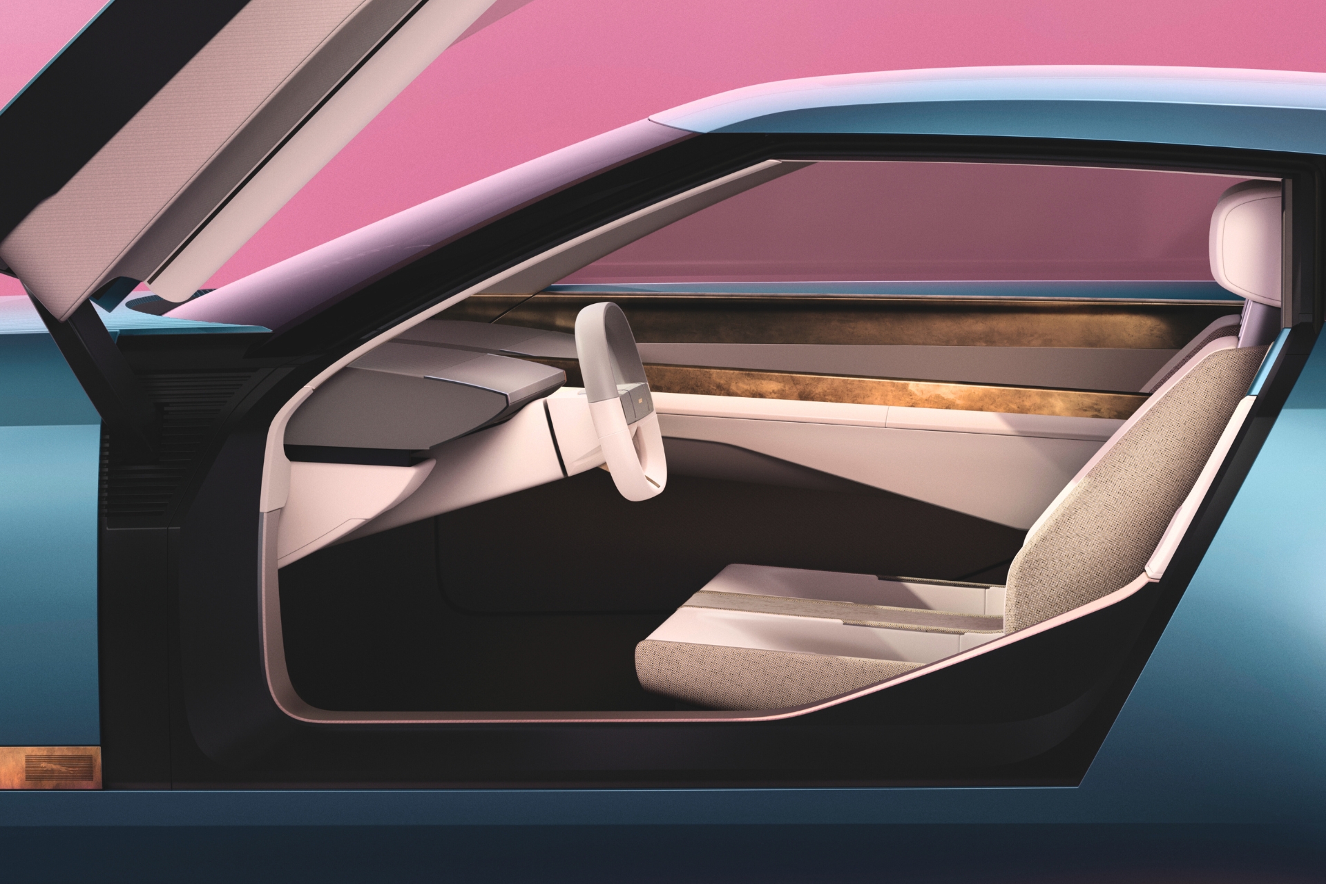 In the metal, the butterfly-doored coupe is a dramatic symbol that refreshingly pushes against the norms of electric-vehicle design as we currently know it. The new Jaguar follows the similarly modernist principles seen on its distant cousins, Range Rover and Defender, but with an added dash of drama or modern exuberance that subtly injects emotion, counterbalanced with simplicity. After all, Jaguar is famous for its emotionally charged sports cars, sleek and feline saloons and athletically sculpted SUVs. Note the use of bold colours, graphic and linear light signatures, the dramatic roofline and long bonnet, as compelling evidence.