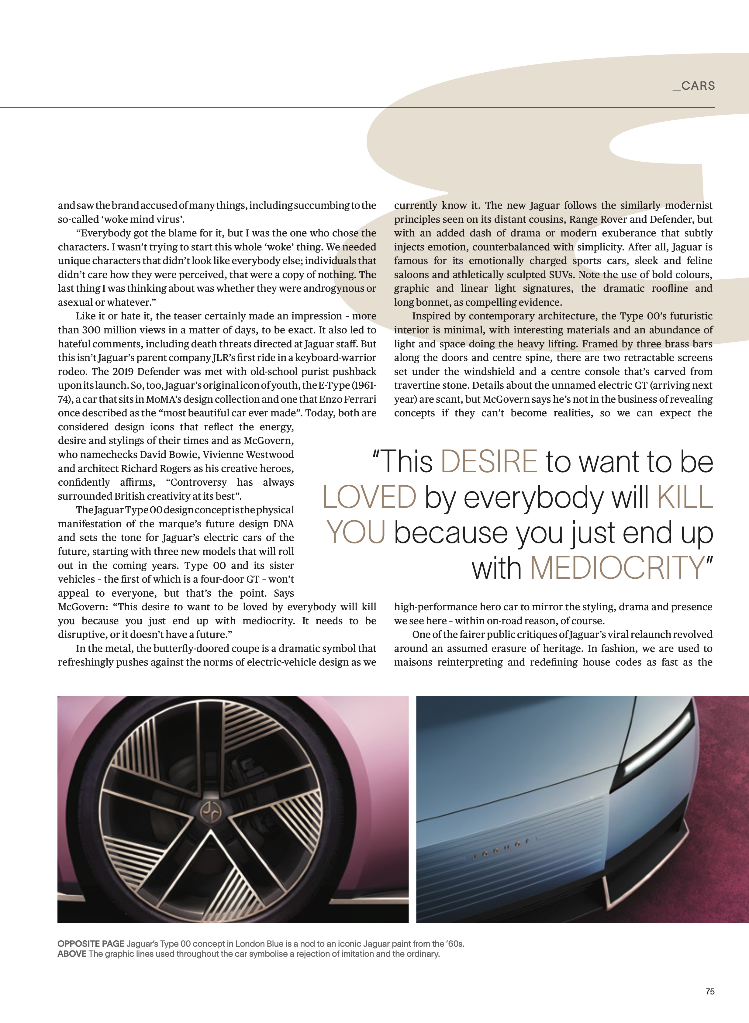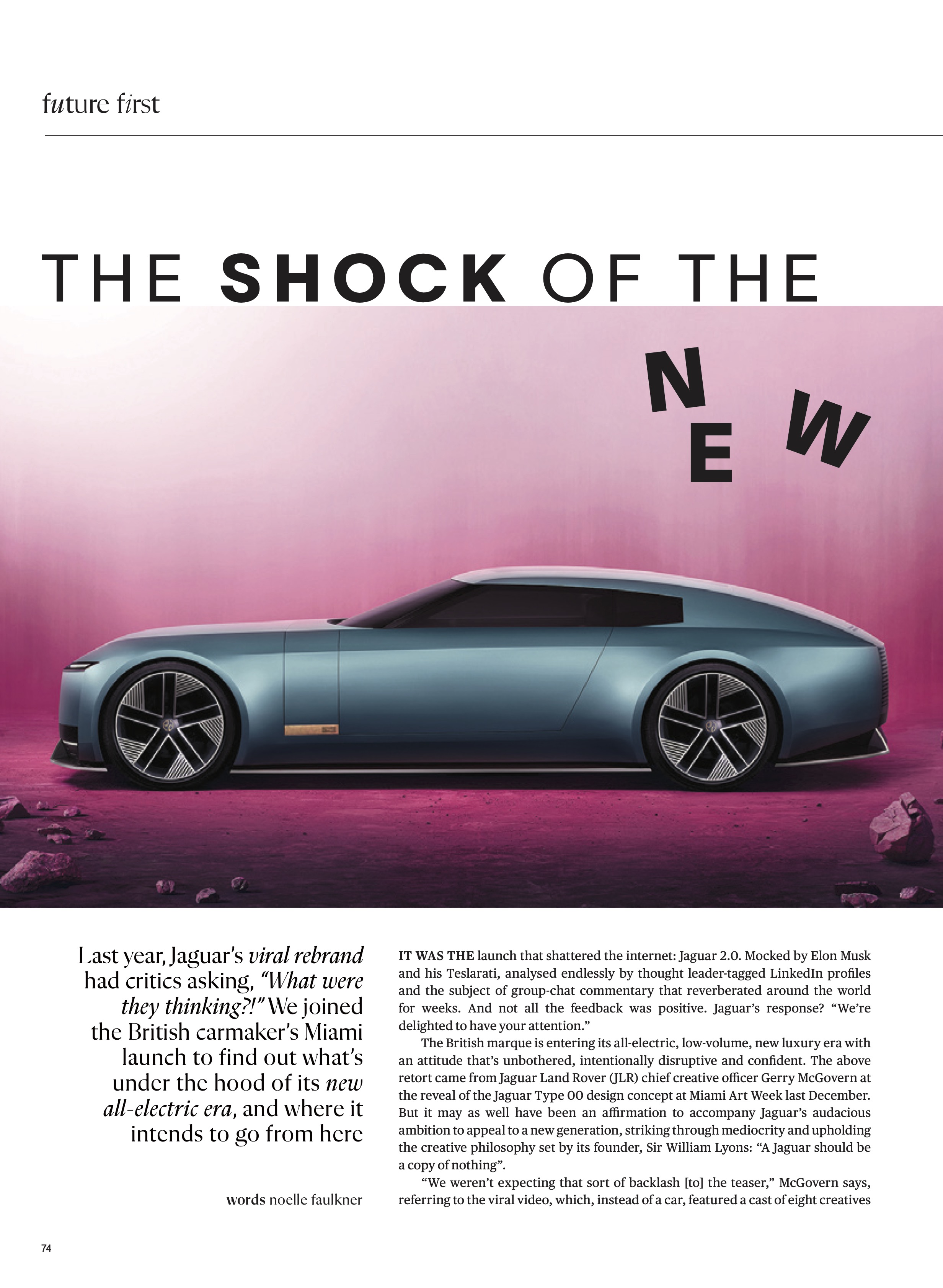 Like it or hate it, the teaser certainly made an impression – more than 300 million views in a matter of days, to be exact. It also led to hateful comments, including death threats directed at Jaguar staff. But this isn’t Jaguar’s parent company JLR’s first ride in a keyboard-warrior rodeo. The 2019 Defender was met with old-school purist pushback upon its launch. So, too, Jaguar’s original icon of youth, the E-Type (1961- 74), a car that sits in MoMA’s design collection and one that Enzo Ferrari once described as the “most beautiful car ever made”. Today, both are considered design icons that reflect the energy, desire and stylings of their times and as McGovern, who namechecks David Bowie, Vivienne Westwood and architect Richard Rogers as his creative heroes, confidently affirms, “Controversy has always surrounded British creativity at its best”.