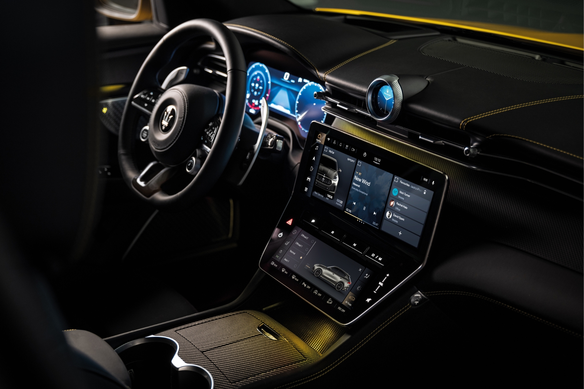 Doubling down on functionality, the Modena marque has also re-considered its technology offering too, or what it refers to as ‘in-car pleasure’—isn’t marketing speak grand? A 12.3-inch screen makes its debut in the centre, placed under the signature (and digitally customisable) Maserati clock. It’s powered by an Android Auto system, but still has Apple CarPlay, and has a dual-tab screen so you can swap between functions easily. Everything is accessible via this system, which can make it a bit confusing at first, but it’s customisable so you can save your favourite functions at will.